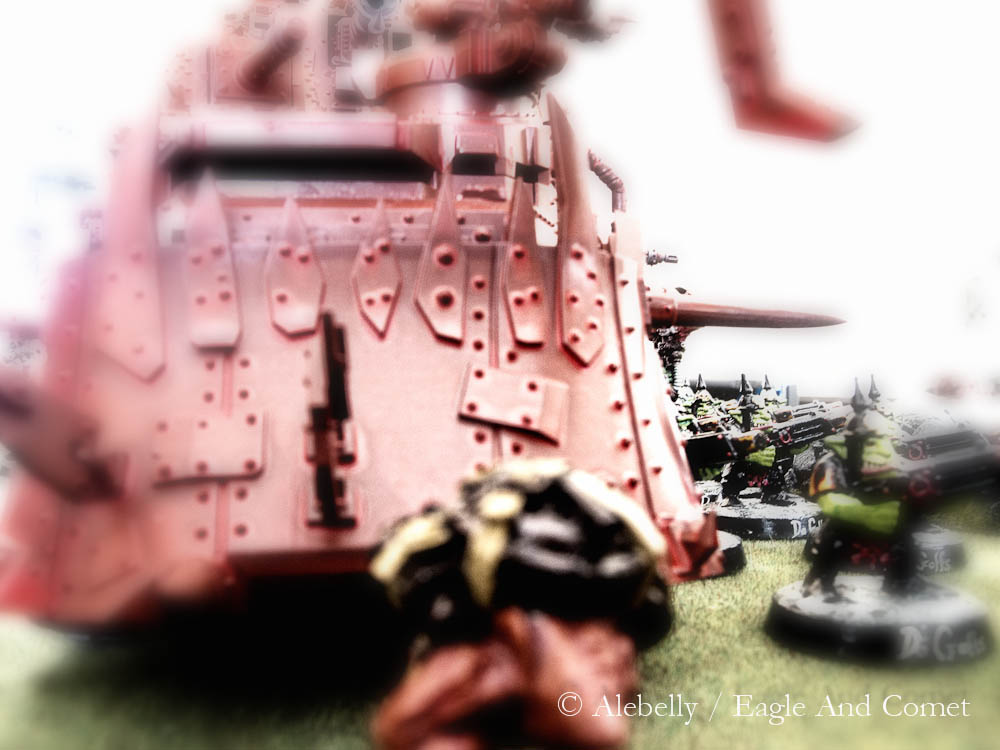 The Orks came late to the field.  Headed, as ever, by the mighty Battlewagon.  Well, a different one to the previous one wrecked by an errant bomb squig.  But a Warboss needs to arrive in style, so no teef were spared in its construction.  Flanked by a Deffdread and herds of Gretchin, and fuelled by copious amounts of fungus brew, the greenskins threw themselves straight into the fray.